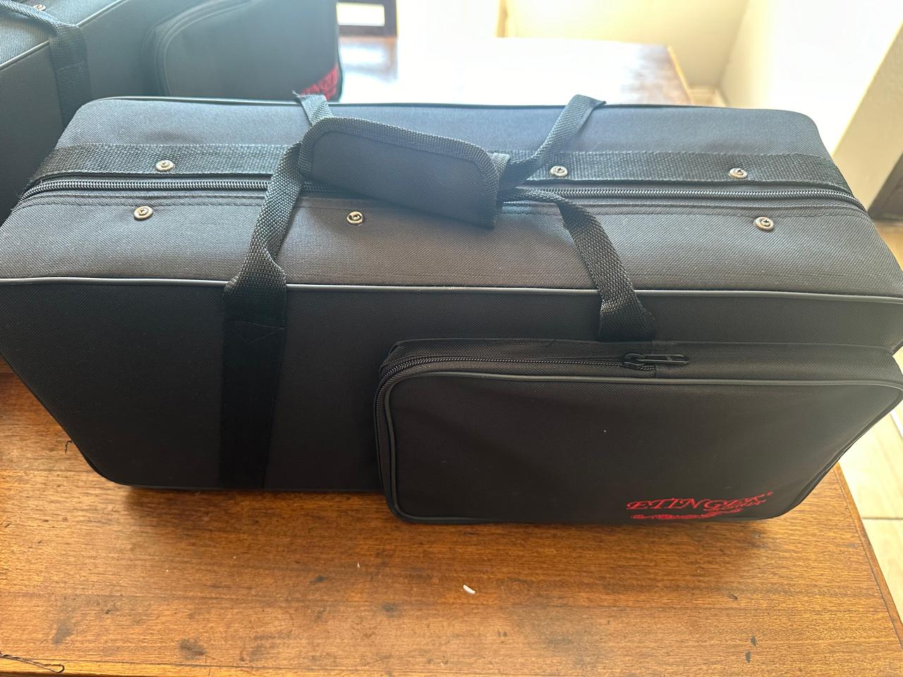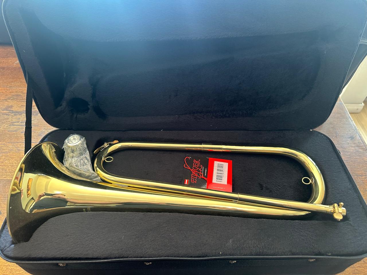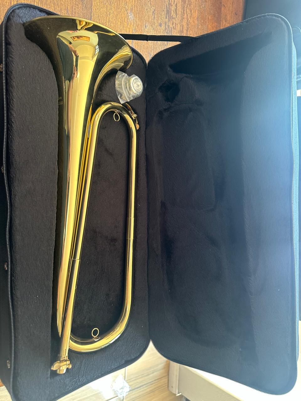 Corneta dorada y niquelada grande con campana de 160mm, incluye llave bota agua (Bota saliva), cases duro tipo mochila para su transporte y boquilla importada modelo 7C niquelada.